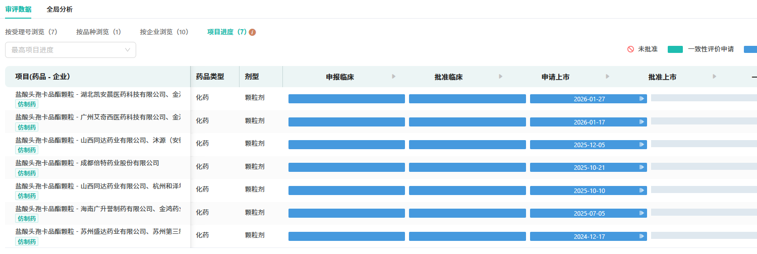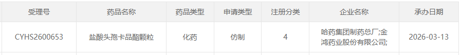 3月13日,国家药品监督管理局药品审评中心(CDE)官网显示,哈药集团与金鸿药业提交的盐酸头孢卡品酯颗粒的4类仿制上市申请获得CDE承办。这意味着,在这款年销过亿、增速迅猛的头孢类明星品种上,国内首仿争夺战又添一位重磅玩家。