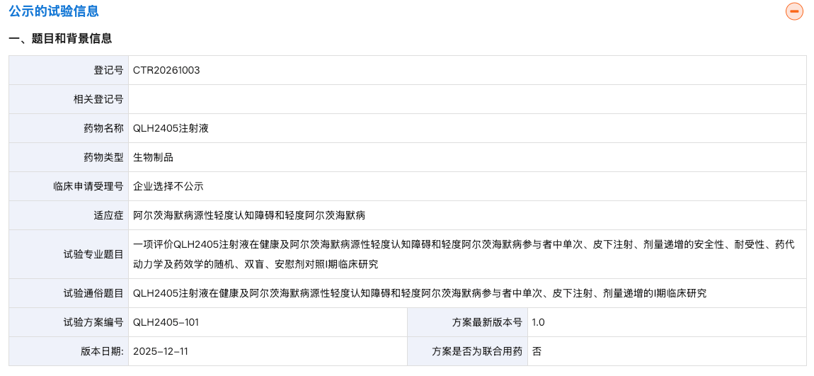 此次,齐鲁制药登记了一项评价QLH2405注射液在健康及阿尔茨海默病源性轻度认知障碍和轻度阿尔茨海默病参与者中单次、皮下注射、剂量递增的安全性、耐受性、药代动力学及药效学的随机、双盲、安慰剂对照Ⅰ期临床研究。