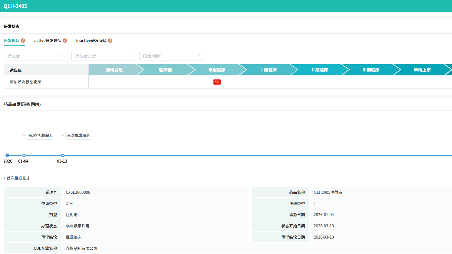 此次进入临床阶段的QLH2405注射液,是齐鲁制药在该疾病领域首个进入临床阶段的1类治疗用生物制品(生物药)。它的临床推进,标志着齐鲁制药在阿尔茨海默病这一重大疾病领域的研发,已从改良剂型深入到源头创新的新阶段。