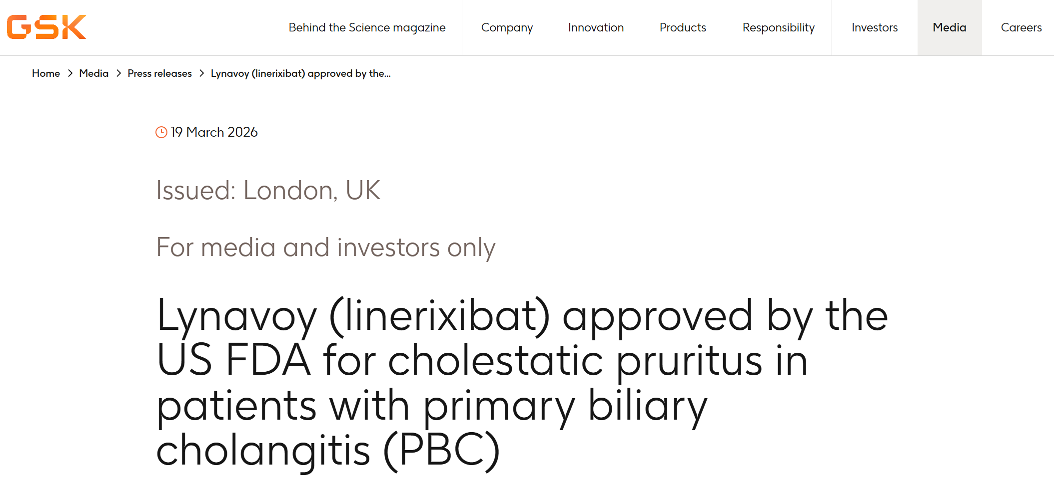 3月19日,葛兰素史克宣布,美国FDA已批准利奈昔巴特(Linerixibat)上市,用于治疗原发性胆汁性胆管炎(PBC)成人患者的胆汁淤积性瘙痒。新闻稿指出,这是首个在美国获批治疗该适应症的药物, 代表着PBC瘙痒治疗领域的一个重要里程碑。