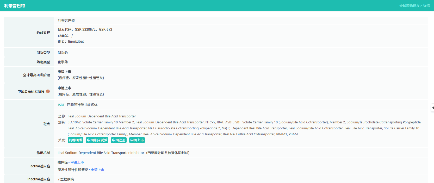 利奈昔巴特是一种口服的回肠胆汁酸转运蛋白(IBAT)抑制剂。其作用机制在于抑制肠道内胆汁酸的再摄取,从而降低全身血液循环中与瘙痒相关的多种介质水平,从源头针对性干预瘙痒的发生。