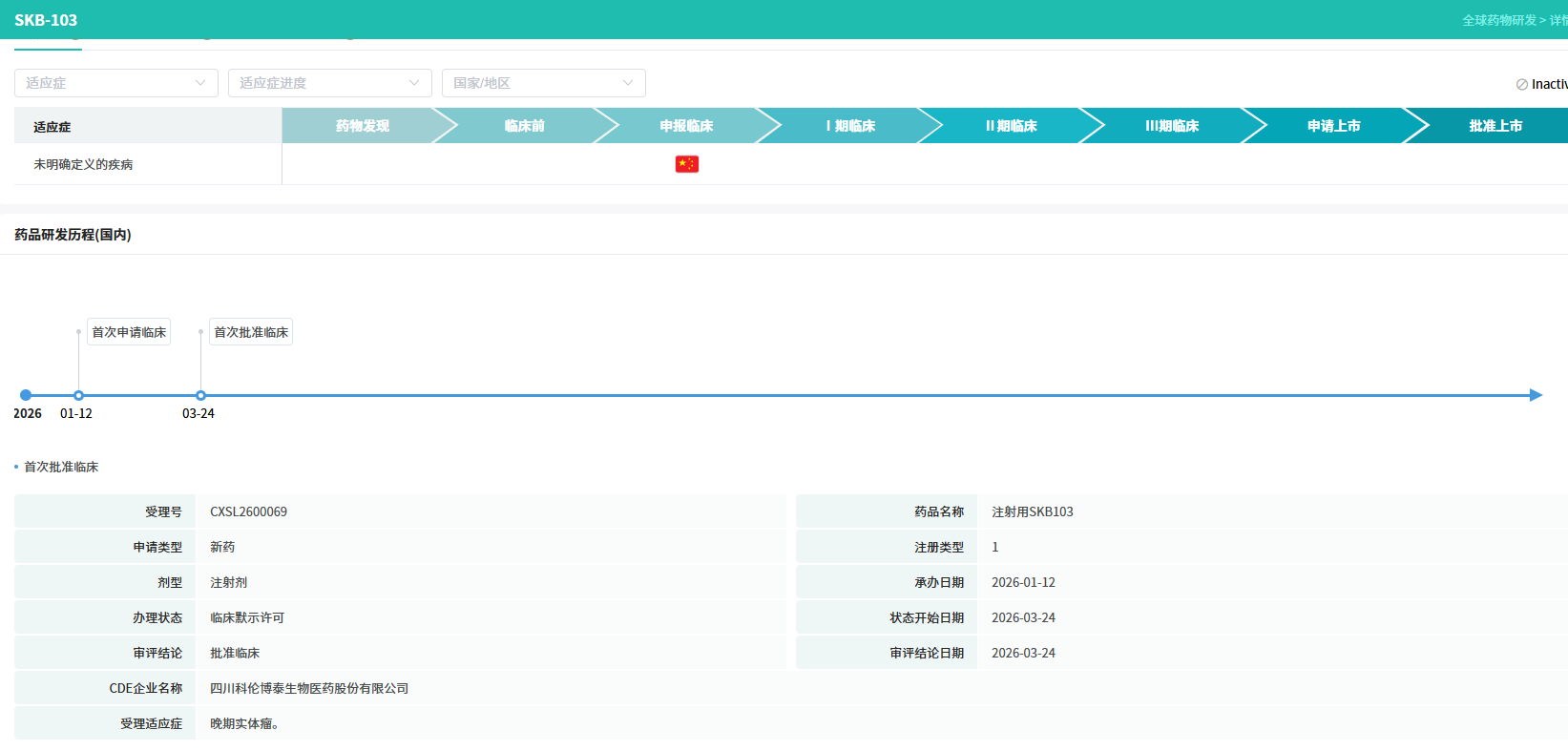 SKB103是科伦博泰基于其专有OptiDC™平台研发的又一款潜力药物。据摩熵医药数据库显示,SKB103在2026年1月12日首次申请临床,3月24日首次获批临床。该药物采用独特设计,有望通过单一分子同时实现两大功能:一是精准递送细胞毒性药物至肿瘤细胞,二是调节肿瘤免疫微环境,从而发挥协同抗肿瘤作用。临床前研究显示,SKB103具有优异的抗肿瘤活性和良好的安全性特征,为后续临床开发奠定了坚实基础。