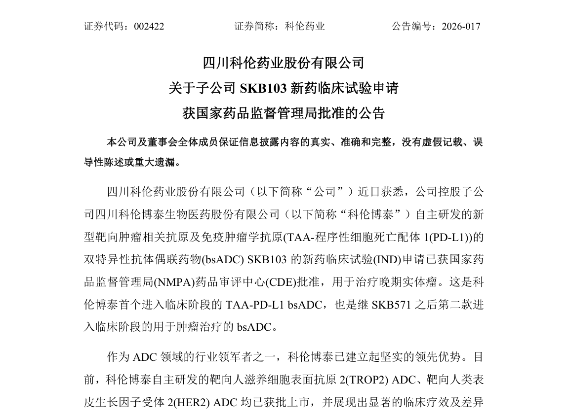 3月25日,科伦药业发布公告,其控股子公司科伦博泰自主研发的新型靶向肿瘤相关抗原(TAA)与程序性死亡配体1(PD-L1)的双特异性抗体偶联药物(bsADC)SKB103,已获国家药监局批准开展临床试验,用于治疗晚期实体瘤。