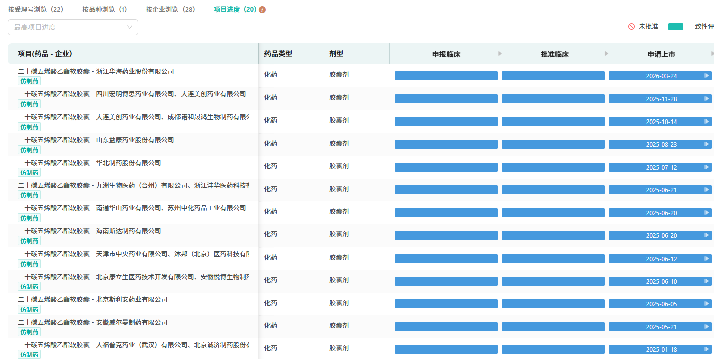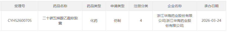3月24日,CDE官网显示,浙江华海药业按4类仿制药申报的二十碳五烯酸乙酯软胶囊上市申请获得受理,正式加入这一高速增长的降脂药市场竞争。摩熵医药数据显示,该品种在2025年全终端医院市场销售额同比增长达1643.56%,成为心血管治疗领域备受瞩目的潜力品种。