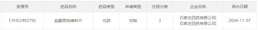 11月7日,据CDE官网显示,石家庄四药提交的3类仿制药盐酸屈他维林片上市申请获受理。据摩熵医药数据库显示,截至目前,该药企在消化系统及代谢药领域已有8款品种过评。