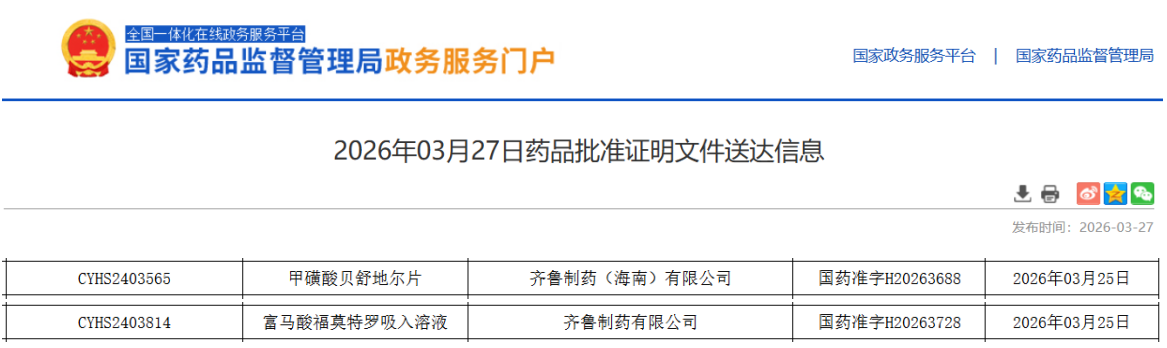3月27日,据NMPA官网显示,齐鲁制药提交的甲磺酸贝舒地尔片和富马酸福莫特罗吸入溶液两款4类仿制药同日获批上市。据摩熵医药数据库显示,此前甲磺酸贝舒地尔片在国内尚无药企获批,齐鲁制药为国内首家拿下该品种的药企。这一进展充分彰显了齐鲁制药在高端新药仿制与吸入制剂领域的强劲实力。