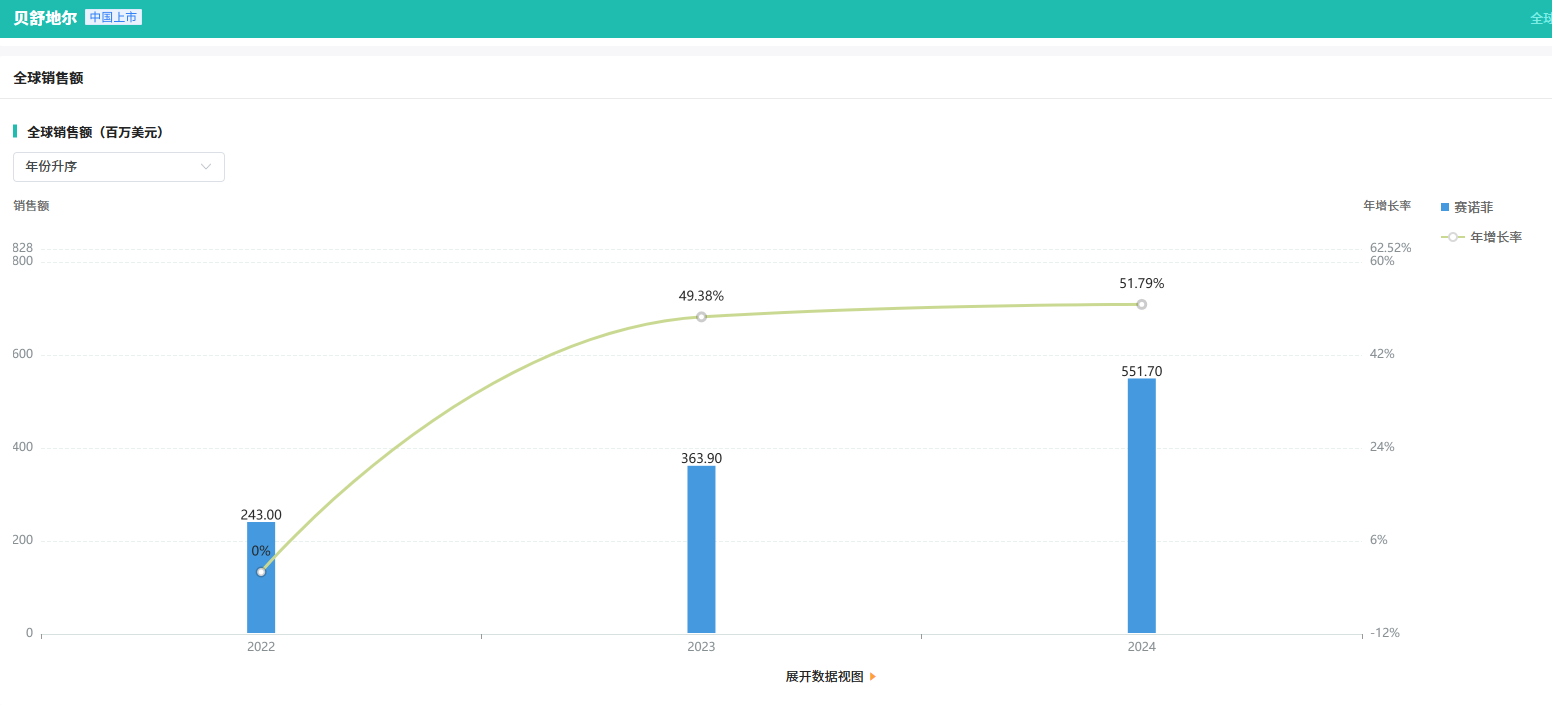 齐鲁制药此次获批,不仅拿下国内首仿,还成为该品种首家通过一致性评价的企业。摩熵医药数据显示,贝舒地尔片在2024年全球销售额已超5亿美元,同比增长达51.79%,市场潜力巨大。