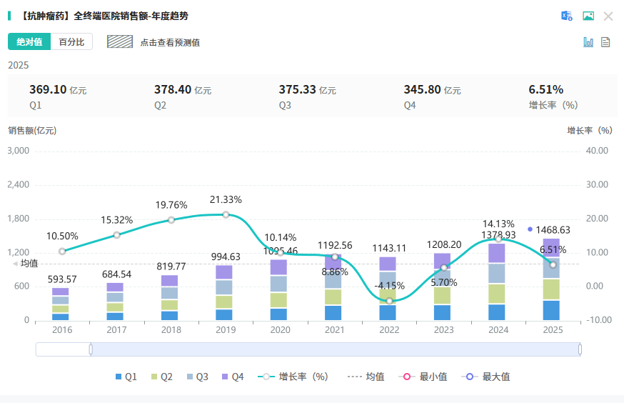 当前,抗肿瘤药物市场正迎来爆发式增长,据摩熵医药数据库显示,2025年全终端医院市场销售额已超1400亿元,同比增速达6.51%。 在这一庞大且高速增长的蓝海市场中,齐鲁制药凭借QLS5132的快速推进,已在CLDN6这一尚处早期竞争阶段的细分赛道抢占了显著的先发优势。
