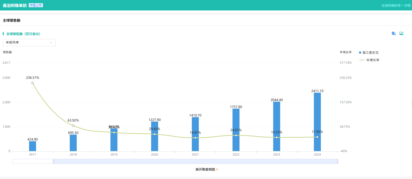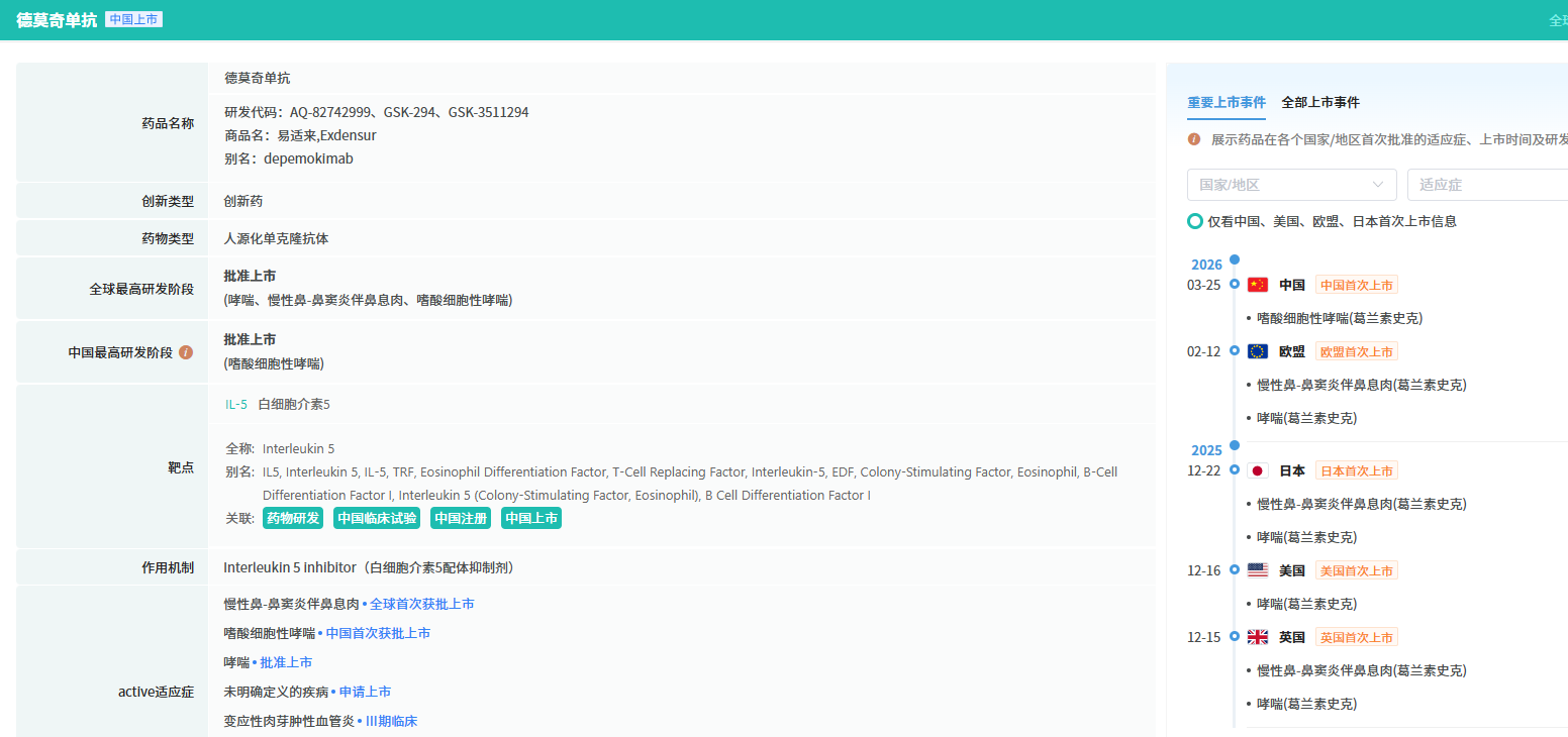 德莫奇单抗并非横空出世,而是GSK在呼吸领域深厚积累下的精准迭代。 其前代产品美泊利珠单抗(商品名:新可来®)自2015年获批以来,已成为治疗嗜酸性粒细胞相关疾病的重磅炸弹。据摩熵医药数据库显示,该药在2024年全球销售额超24亿美元,2025年全球销售额高达26.51亿美元,稳坐市场头把交椅。