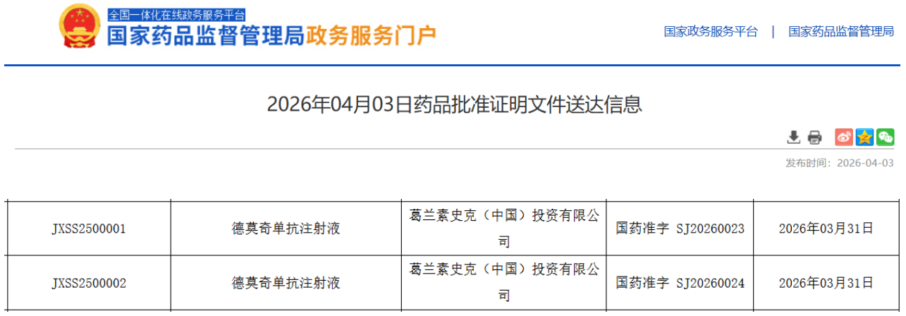 4月3日,国家药监局(NMPA)官网公示,葛兰素史克(GSK)的德莫奇单抗(depemokimab)新适应症获批,用于治疗慢性鼻-鼻窦炎伴鼻息肉(CRSwNP)。这距离其首个适应症——重度嗜酸性粒细胞性哮喘(SEA)在国内获批,仅过去一周。