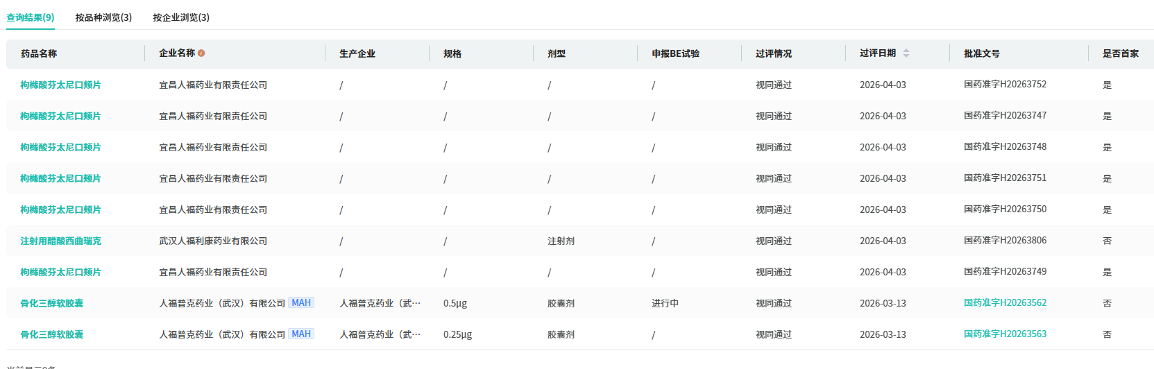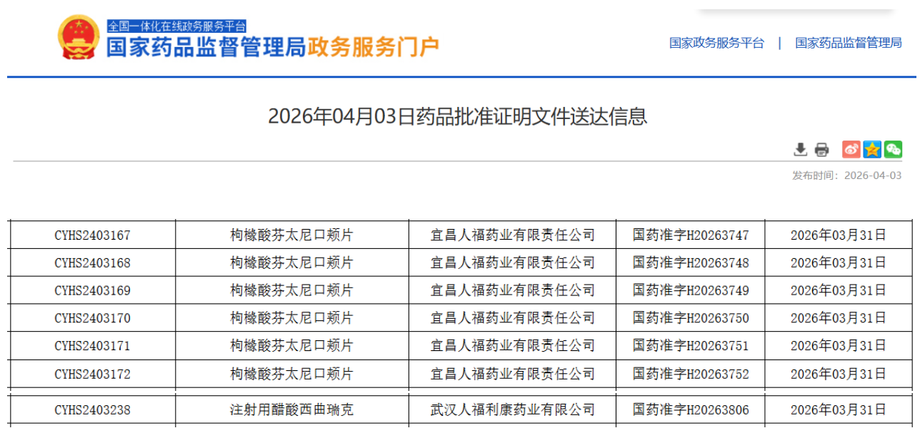 4月3日,国家药监局(NMPA)官网显示,人福医药提交的枸橼酸芬太尼口颊片、注射用醋酸西曲瑞克两款仿制药同日获批生产并视同过评。其中,枸橼酸芬太尼口颊片为国内首仿和首家过评,进一步巩固了人福在国内镇痛药领域的领军地位。