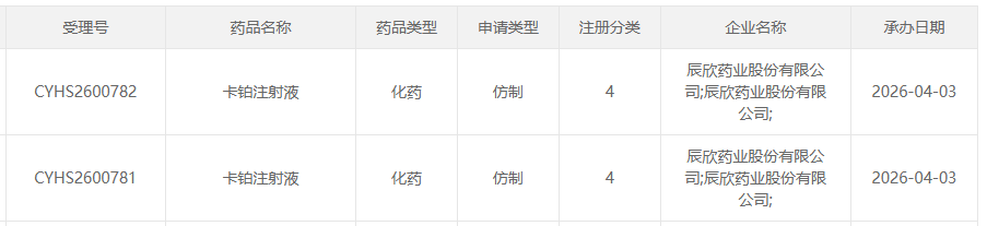 4月3日,国家药监局药品审评中心(CDE)官网显示,辰欣药业提交的卡铂注射液以仿制4类报产获受理,正式入局这一市场规模超7亿元的抗肿瘤注射剂赛道。