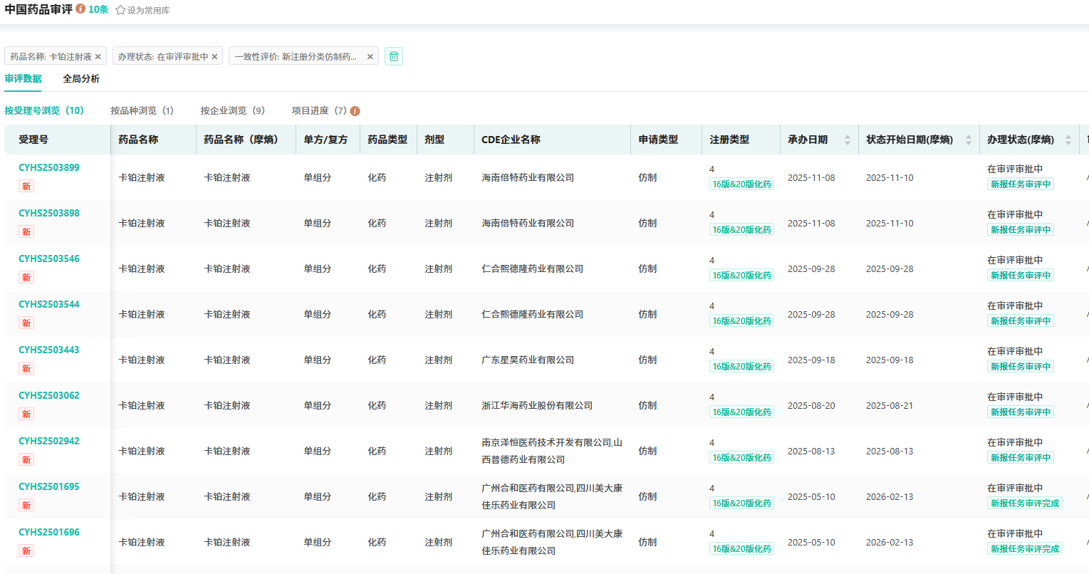 截至目前,除已获批的8家企业外,还有海南倍特药业、浙江华海药业、广东星昊药业等9家企业已提交卡铂注射液的上市申请,正处于审评审批阶段。