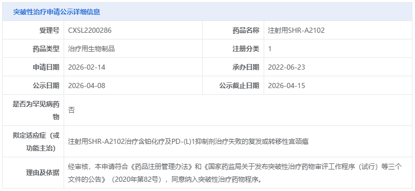 4月8日,国家药监局药品审评中心(CDE)官网公示,恒瑞医药旗下SHR-A2102的一项申请拟纳入突破性治疗品种,适应症为治疗含铂化疗及PD-(L)1抑制剂治疗失败的复发或转移性宫颈癌。这是该产品继尿路上皮癌后获得的第二项突破性疗法认定,也标志着国内第2款进入Ⅲ期临床的国产Nectin-4 ADC,正加速向临床“硬骨头”发起冲击。