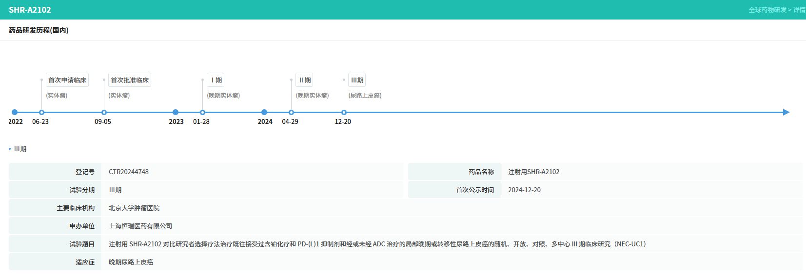 这并非SHR-A2102首次获得监管青睐。2024年12月,其单药治疗既往含铂化疗和PD-(L)1抑制剂治疗失败的局部晚期或转移性尿路上皮癌的申请,已被CDE纳入突破性治疗品种。在美国,FDA也已授予其治疗晚期尿路上皮癌适应症的快速通道资格。
