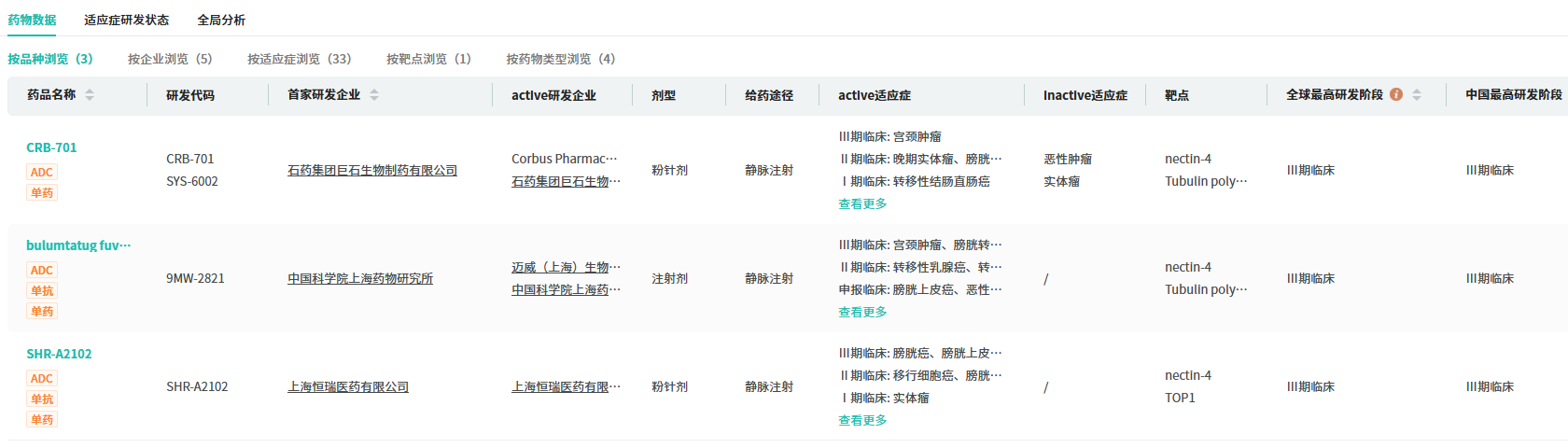 国内相关领域的竞争格局已初步显现。据摩熵医药数据库显示,除已上市的维恩妥尤单抗外,当前共有三款国产Nectin-4 ADC药物迈入Ⅲ期临床阶段,呈现出“三强争锋”的竞争态势,这三款药物分别是迈威生物的9MW2821、恒瑞医药的SHR-A2102以及石药集团的SYS6002。