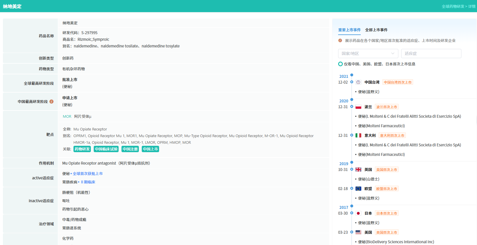 纳地美定(Naldemedine)由盐野义制药株式会社研发,是全球首个获批的口服选择性外周μ-阿片受体拮抗剂,它可以在外周组织(特别是肠道神经系统)中,通过拮抗阿片类药物对肠道神经系统的生理影响,调节肠道的蠕动和分泌活动,从根本上治疗OIC。目前,该药物已在美国、欧盟、日本,及中国台湾、香港、澳门地区获批上市。2025年1月2日,中国生物制药附属公司正大天晴药业集团与盐野义集团签订独家市场推广协议,获授予纳地美定在中国大陆地区的独家市场推广权。