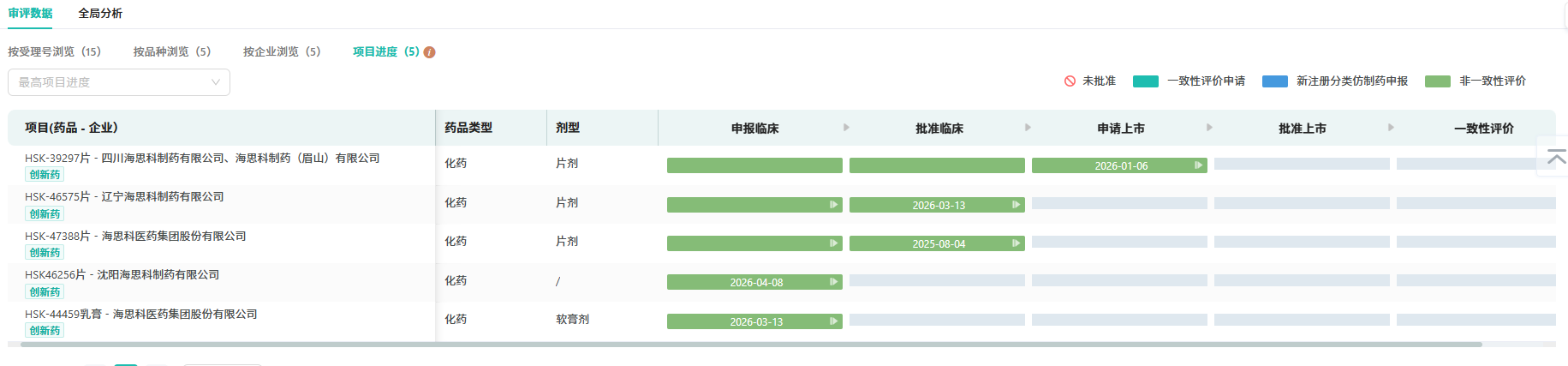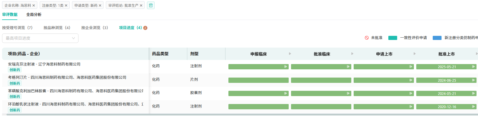 截至目前,海思科已有安瑞克芬注射液、考格列汀片、苯磺酸克利加巴林胶囊、环泊酚乳状注射液4款1类新药在国内成功获批上市,覆盖神经系统、消化系统及代谢两大治疗领域,为公司构建了稳定的创新药商业化梯队。