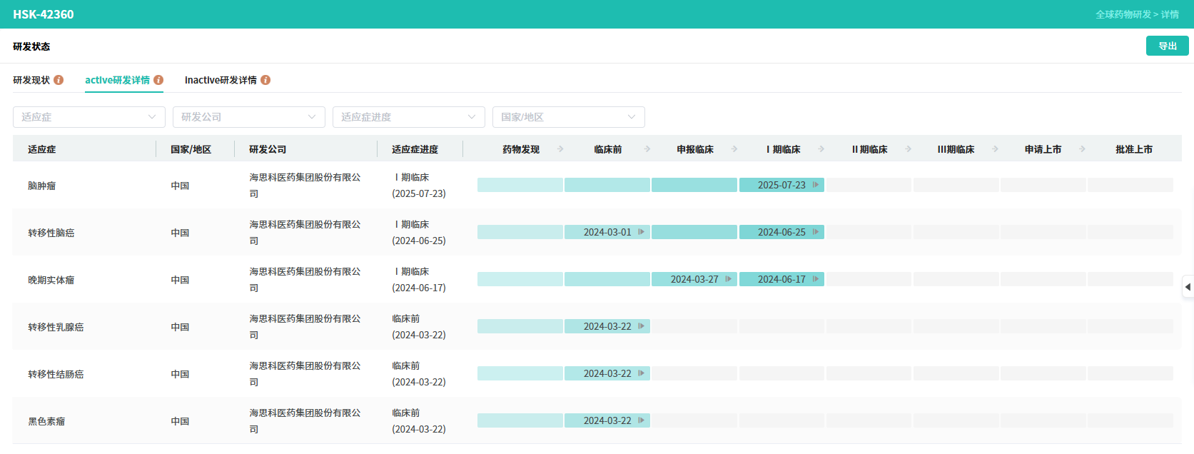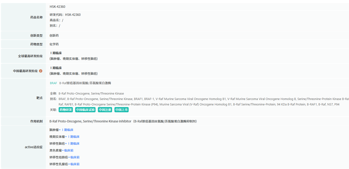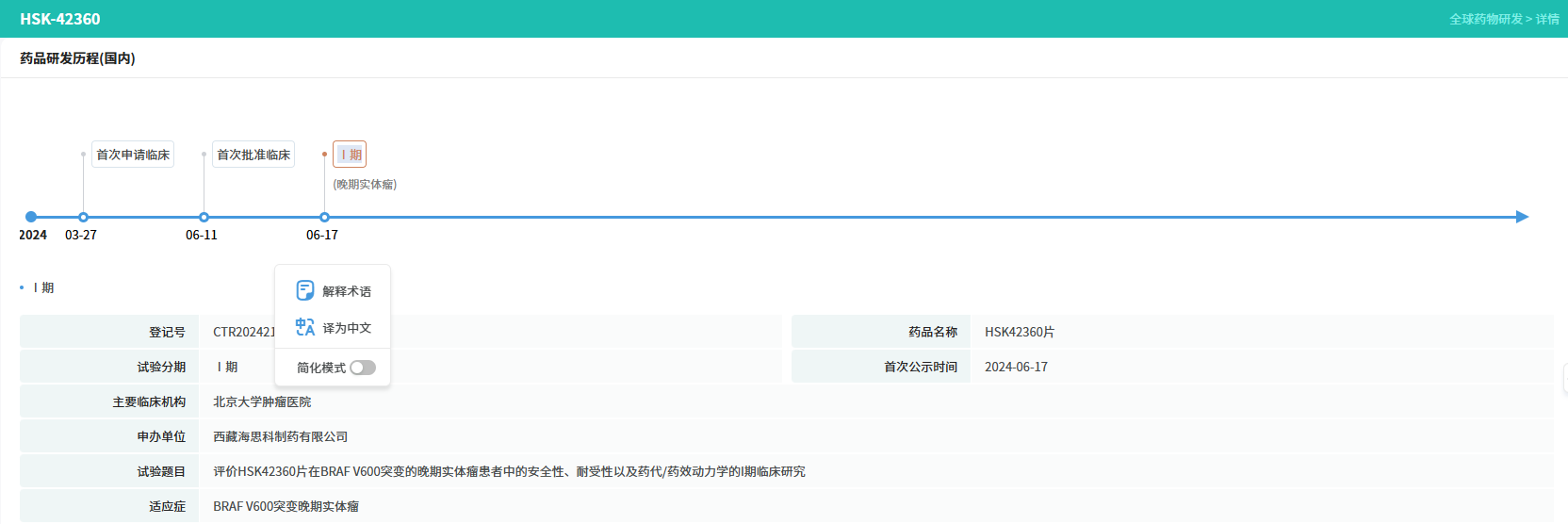 HSK42360是海思科自主研发的一款靶向BRAF V600突变且具有脑渗透性的小分子抑制剂,拟开发用于治疗BRAF V600突变晚期实体瘤。临床前研究显示,该药在多个BRAF V600突变的实体瘤药效模型中展现出极佳的抗肿瘤活性,同时表现出了良好的耐受性和较大的安全窗。2024年3月,HSK42360正式提交临床申请;6月11日,顺利获得首次临床批准;仅仅6天后,即6月17日,便迅速推进至晚期实体瘤Ⅰ期临床试验阶段,研发进程高效有序。