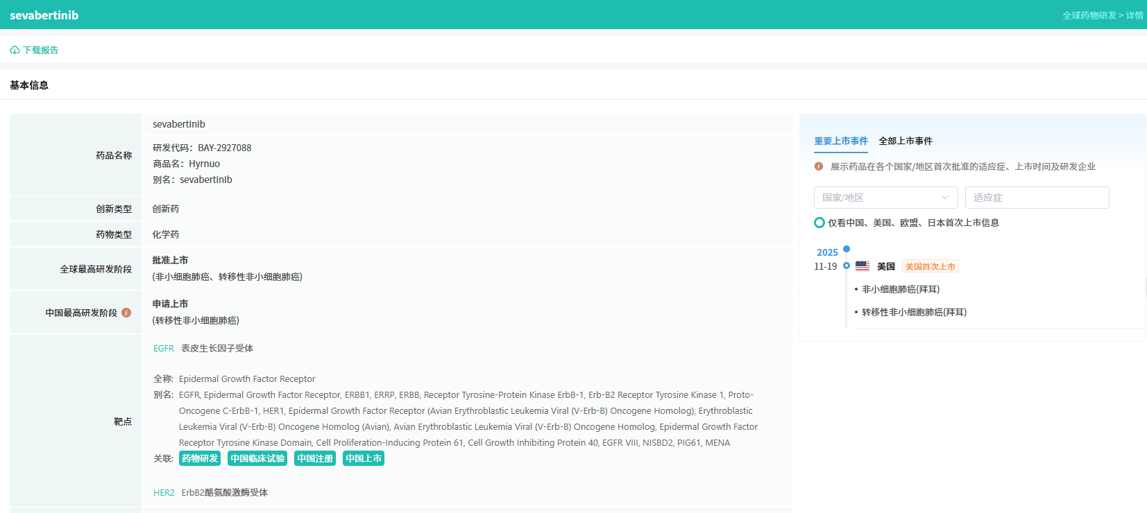2025年11月19日,塞伐艾替尼已在美国获批上市,用于治疗经FDA批准的伴随诊断证实携带HER2酪氨酸激酶结构域激活突变、且接受过系统治疗的局部晚期或转移性非鳞状NSCLC成人患者。