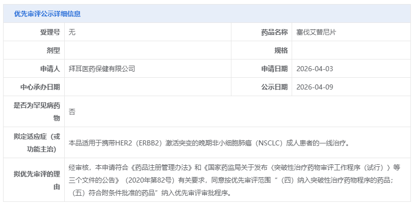 2026年4月9日,CDE官网公示,拜耳的肺癌新药塞伐艾替尼片(sevabertinib)拟纳入优先审评程序,用于一线治疗携带HER2激活突变的晚期非小细胞肺癌(NSCLC)成人患者。这是继2025年7月其首次提交上市申请后,该药在中国递交的第二个新适应症申请,标志着其临床应用阵线正加速向前推移。