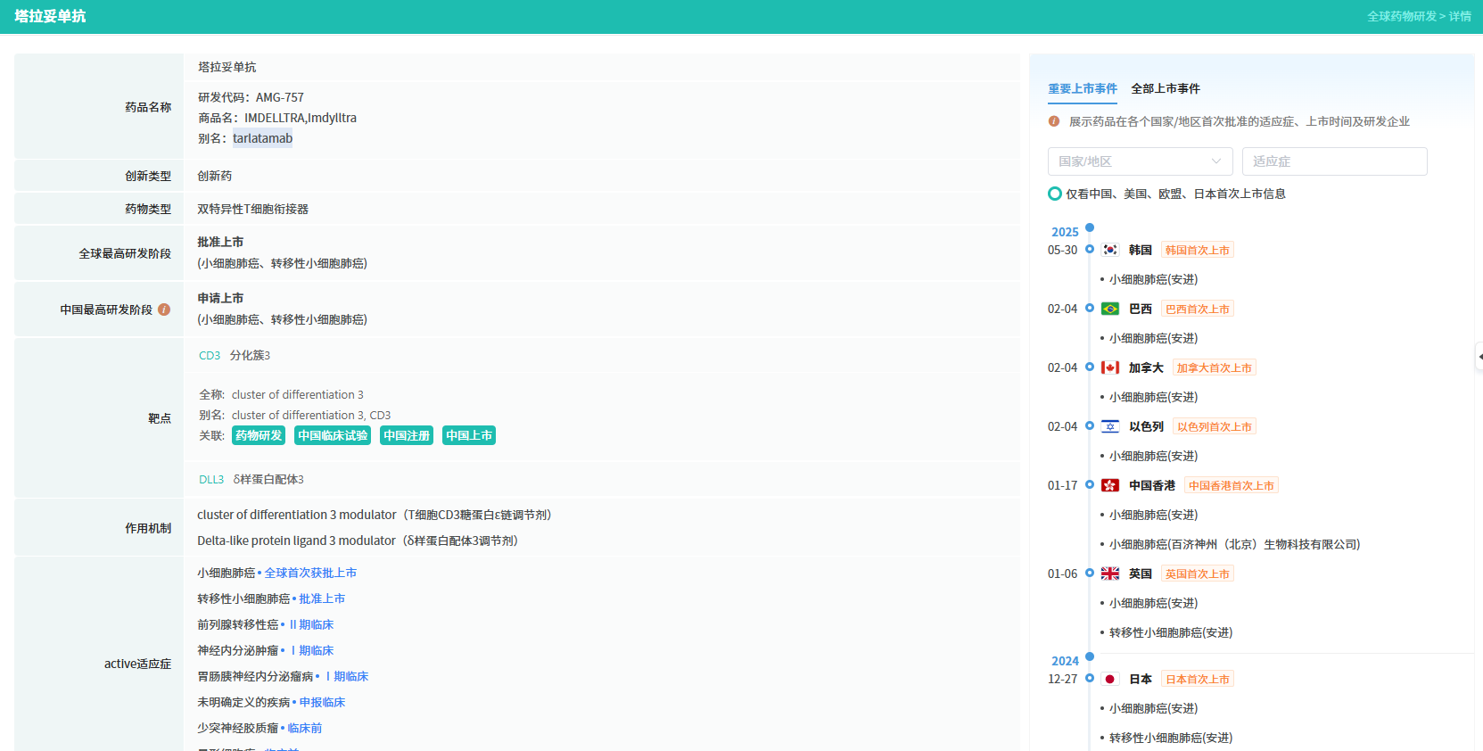 据摩熵医药数据库显示,该药最早于2024年5月在美国获批上市,用于治疗含铂化疗失败的ES-SCLC成人患者;同年12月,该药在日本获批,而后于2025年度陆续在英国、加拿大等国家和地区获批上市。在国内,塔拉妥单抗的首个上市申请于2025年7月提交,并被纳入优先审评,今日终于正式获批。