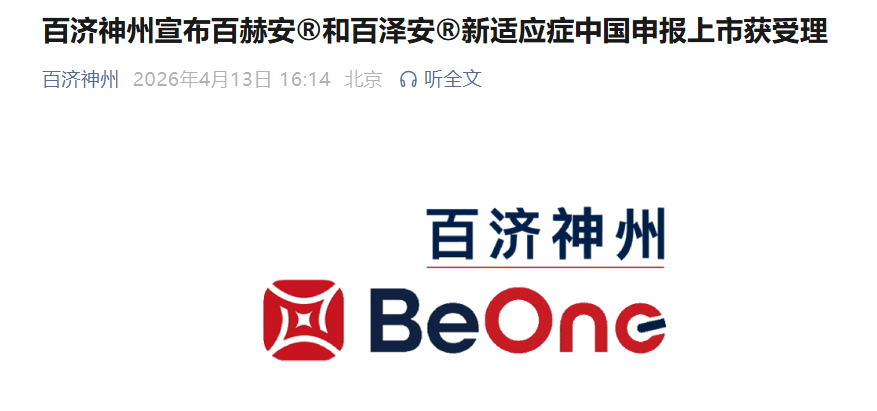 4月13日,百济神州宣布,基于百赫安®(泽尼达妥单抗)联合疗法的相关研究结果,CDE已分别受理泽尼达妥单抗与百泽安®(替雷利珠单抗)的新增适应症上市许可申请(sBLA),均拟用于局部晚期不可切除或转移性HER2阳性胃、胃食管结合部或食管腺癌(GEA,简称“胃食管腺癌”)的一线治疗。