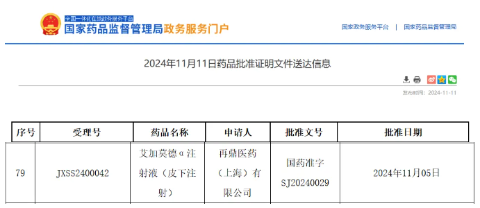 11月11日,NMPA 官网显示,再鼎医药的艾加莫德α注射液(皮下注射)获得一项新适应症批准(JXSS2400042)。该申请曾被 CDE 纳入优先审评,用于治疗成人慢性炎性脱髓鞘性多发性神经根神经病(CIDP)患者。