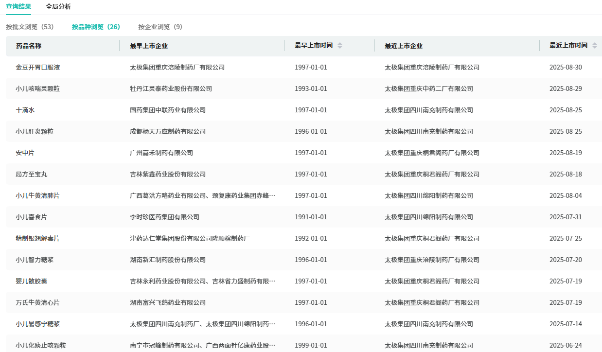 摩熵医药数据显示,太极集团在中成药儿童用药市场已有26个产品获批上市,其中金豆开胃口服液、小儿暑感宁糖浆、双苓止泻口服液、儿康宁糖浆四款为独家品种。双苓止泻颗粒的临床推进,有望进一步巩固和扩大其在儿科中药市场的领先地位。