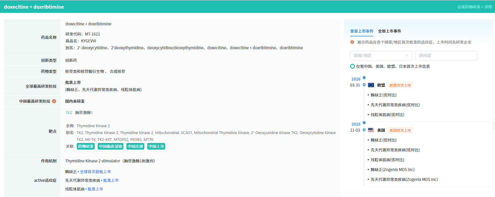 据摩熵医药数据库显示,KYGEVVI已于2025年11月3日在美国首次上市,成为全球首个TK2d治疗药物。2026年3月31日在欧盟首次上市。目前,该药物在欧盟已获批用于治疗以下适应症:酶缺乏症(优时比)、先天性代谢异常类疾病(优时比)、线粒体肌病(优时比)。