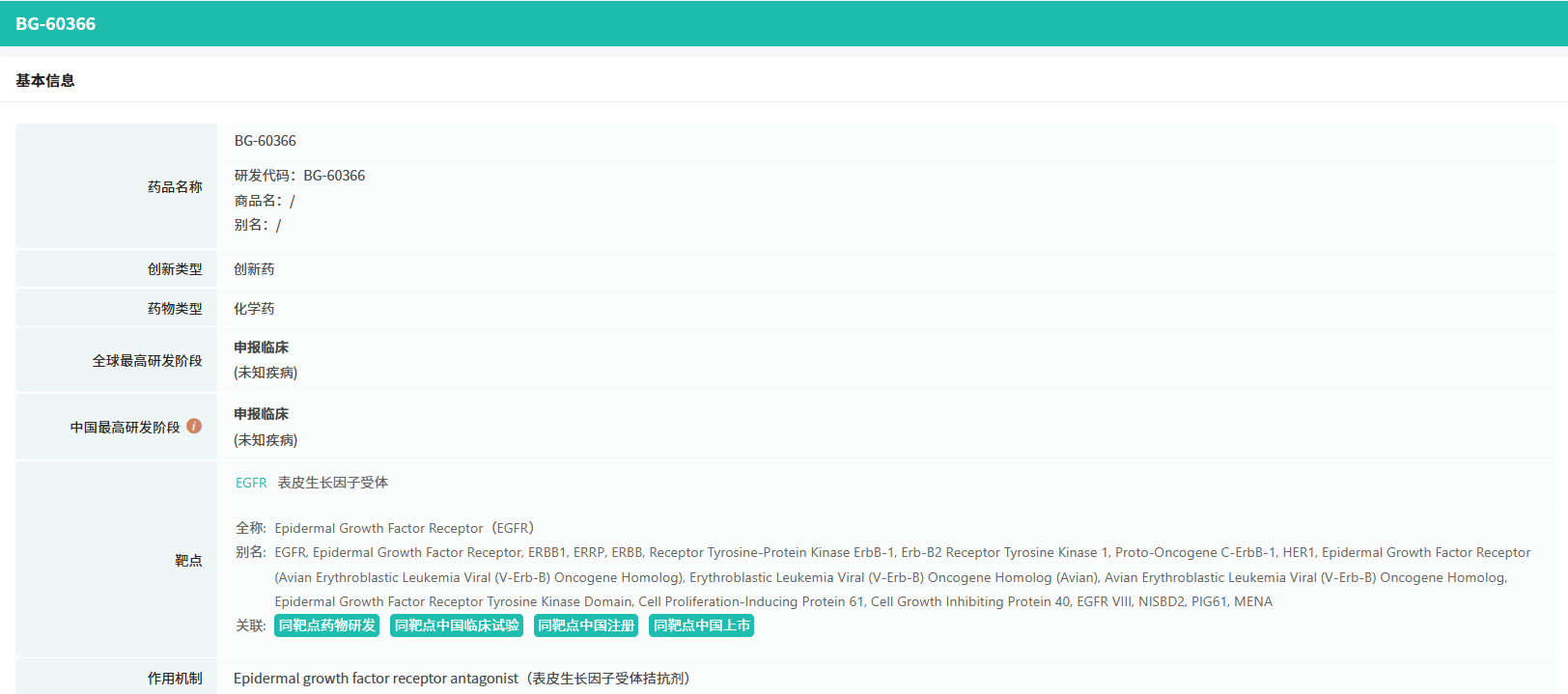 据摩熵医药数据库显示,BG-60366作为百济神州研发的新型EGFR嵌合式降解激活化合物(CDAC),具有广泛覆盖多种EGFR突变的能力。它能够破坏EGFR支架功能,从而产生持久的信号抑制作用。在前期治疗线中,BG-60366的非冗余机制有望有效防止耐药性的发生,为患者提供更长久的治疗效果。