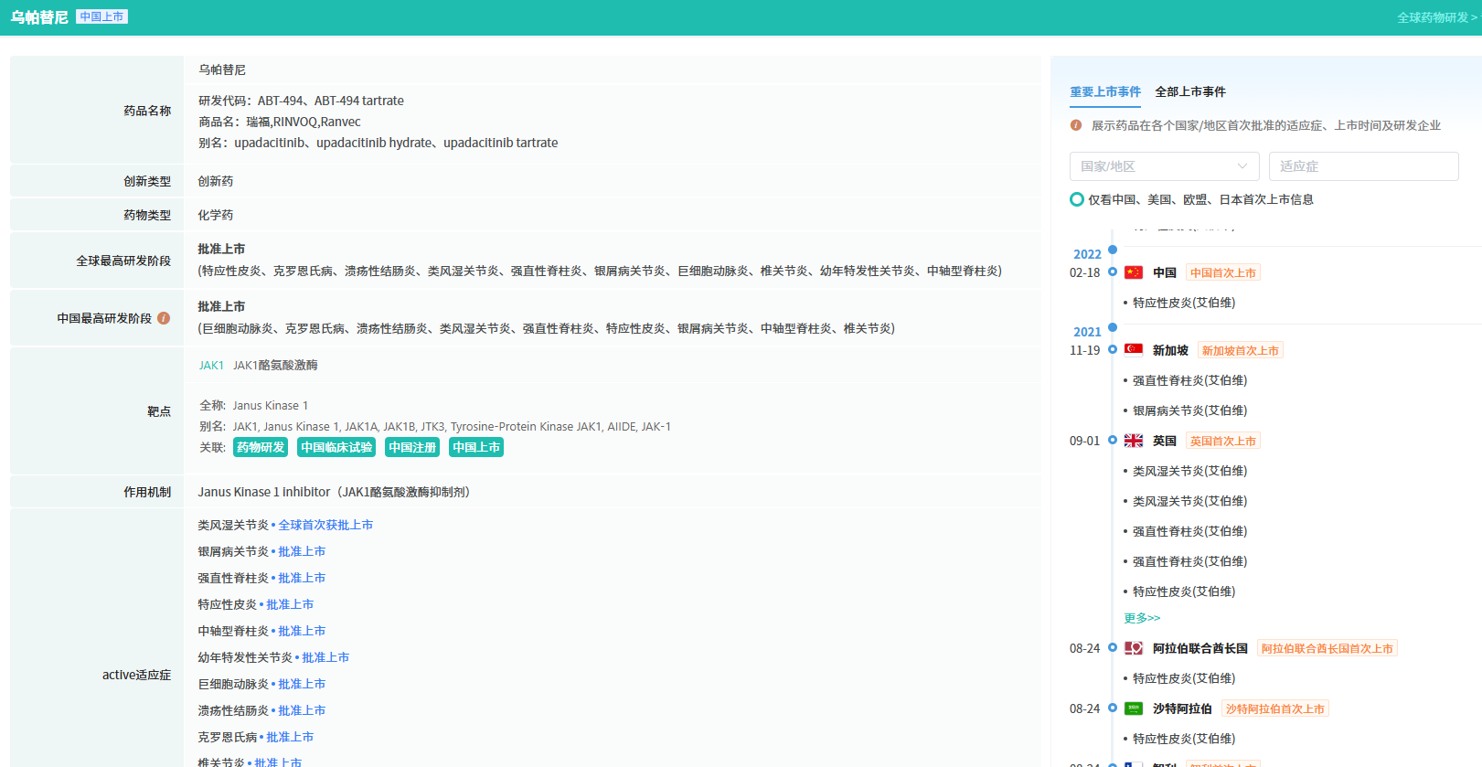 乌帕替尼缓释片是由艾伯维开发的一款口服选择性JAK抑制剂,通过抑制JAK1介导的细胞因子信号通路,调节免疫反应,用于治疗类风湿关节炎、特应性皮炎、银屑病关节炎、溃疡性结肠炎等多种自身免疫性疾病。该药于2019年8月率先在美国获批上市,2022年2月在中国获批,并被纳入国家医保乙类药品目录,大幅提升了药物的可及性。