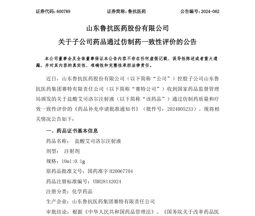11月19日,据鲁抗医药发布公告称,控股子公司山东鲁抗赛特的盐酸艾司洛尔注射液通过仿制药一致性评价。据摩熵医药数据库显示,该品种在2023年全国院内市场的销售额超8亿元。