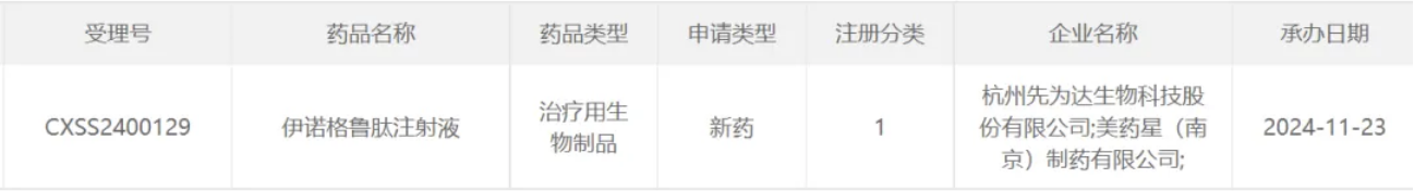 近日,先为达生物收到国家药品监督管理局下发的《受理通知书》,公司提交的1类新药伊诺格鲁肽注射液(Ecnoglutide Injection)成人2型糖尿病患者血糖控制的适应症上市许可申请获国家药品监督管理局受理。