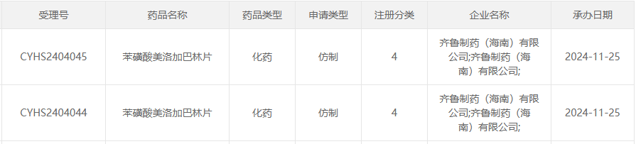 11月26日,据CDE官网公示,齐鲁制药(海南)提交的苯磺酸美洛加巴林片上市申请已获受理。