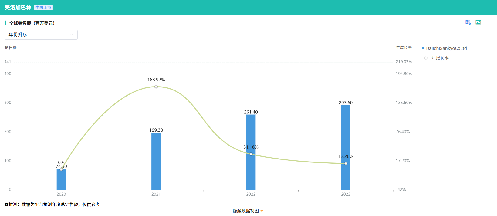 苯磺酸美洛加巴林片是第一三共的原研产品,是一种新一代钙离子通道调节剂,适应症为糖尿病性周围神经病理性疼痛(DPNP)。2019年1月,该药品在日本首次获得批准上市,其应用范围覆盖周围神经病理性疼痛(PNP)的治疗。作为一款临床上迫切需求的进口药物,苯磺酸美洛加巴林片自上市以来,全球销售额持续迅猛增长。据摩熵医药数据库的统计,2023年苯磺酸美洛加巴林片在全球的销售额已接近3亿美元,同比增长达12.26%。
