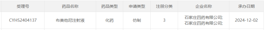 12月02日,据CDE官网公示,石家庄四药提交的布美他尼注射液上市申请已获受理。该品种是一款新型髓袢利尿剂,据摩熵医药数据库显示,布美他尼注射液在2023年全国院内的销售额超过3亿元。