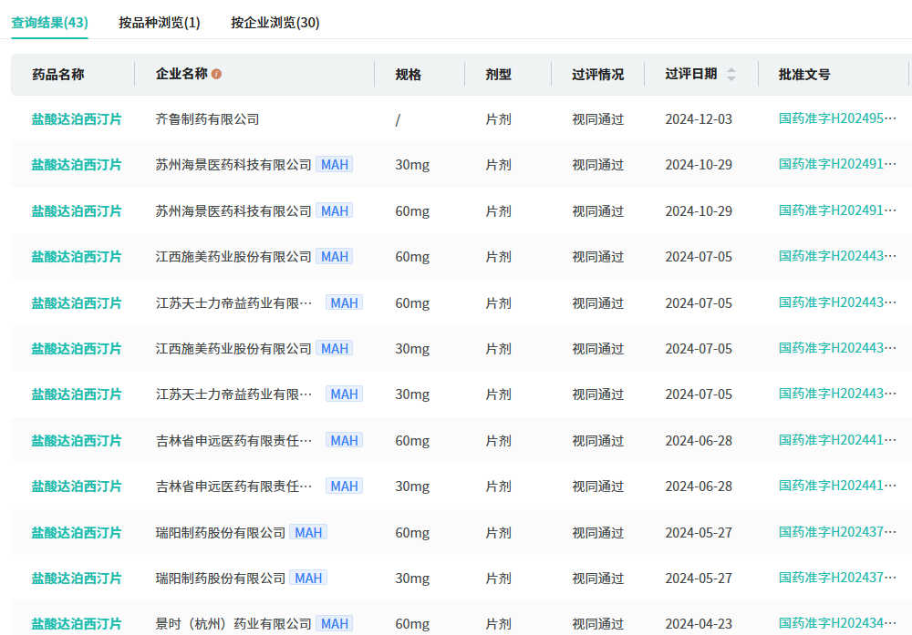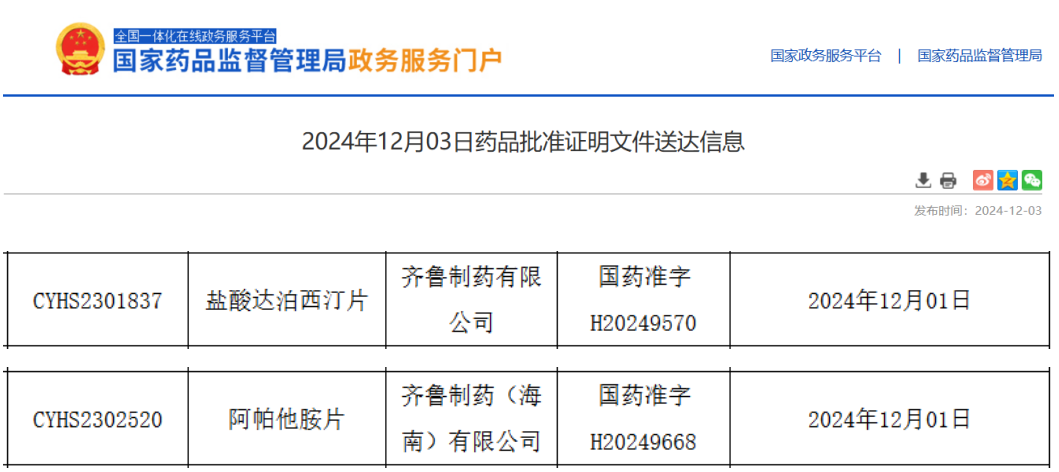 12月3日,据NMPA官网公示,齐鲁制药(含子公司)提交的盐酸达泊西汀片和阿帕他胺片两款4类仿制药获批生产并视同过评,其中阿帕他胺片除原研,国内暂无药企获批。此次,齐鲁制药顺利获批,成为国内该品种的首仿药企。