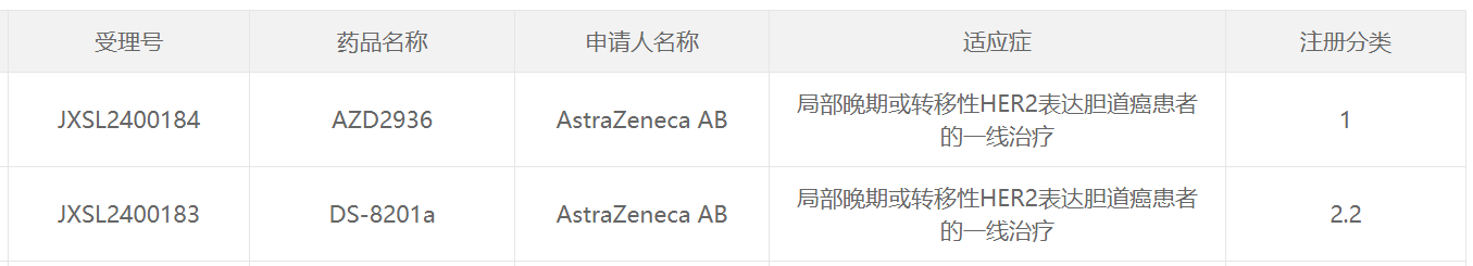 12月5日,据CDE官网最新公示显示,由阿斯利康申报的 AZD2936 和 DS-8201a 两款新药同时获得临床试验默示许可,适应症为局部晚期或转移性HER2表达胆道癌患者的一线治疗。