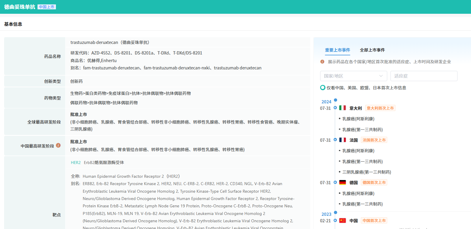 据摩熵医药数据库显示,DS-8201a 是一款由阿斯利康携手第一三共精心研发的抗体偶联药物(ADC),精准靶向HER2。该药物于2023年2月21日在中国市场迎来了它的首次亮相。