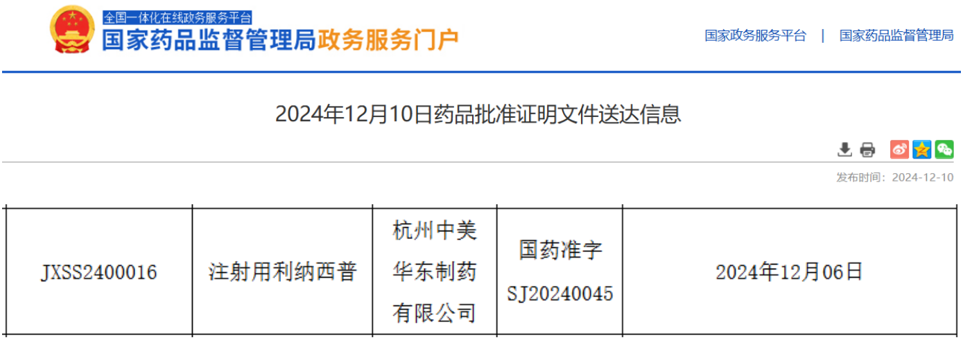 12月10日,据NMPA官网最新公示,华东医药全资子公司中美华东申报的注射用利纳西普新适应症上市申请已获得批准。这是中美华东与Kiniksa Pharmaceuticals的全资子公司携手研发的一款IL-1抑制剂,已于今年11月在中国率先获得批准,用于治疗冷吡啉相关周期性综合征(CAPS)。根据CDE的优先审评公示,该药物新增适应症为:治疗成人及12岁及以上青少年复发性心包炎(RP),并有效降低复发风险。