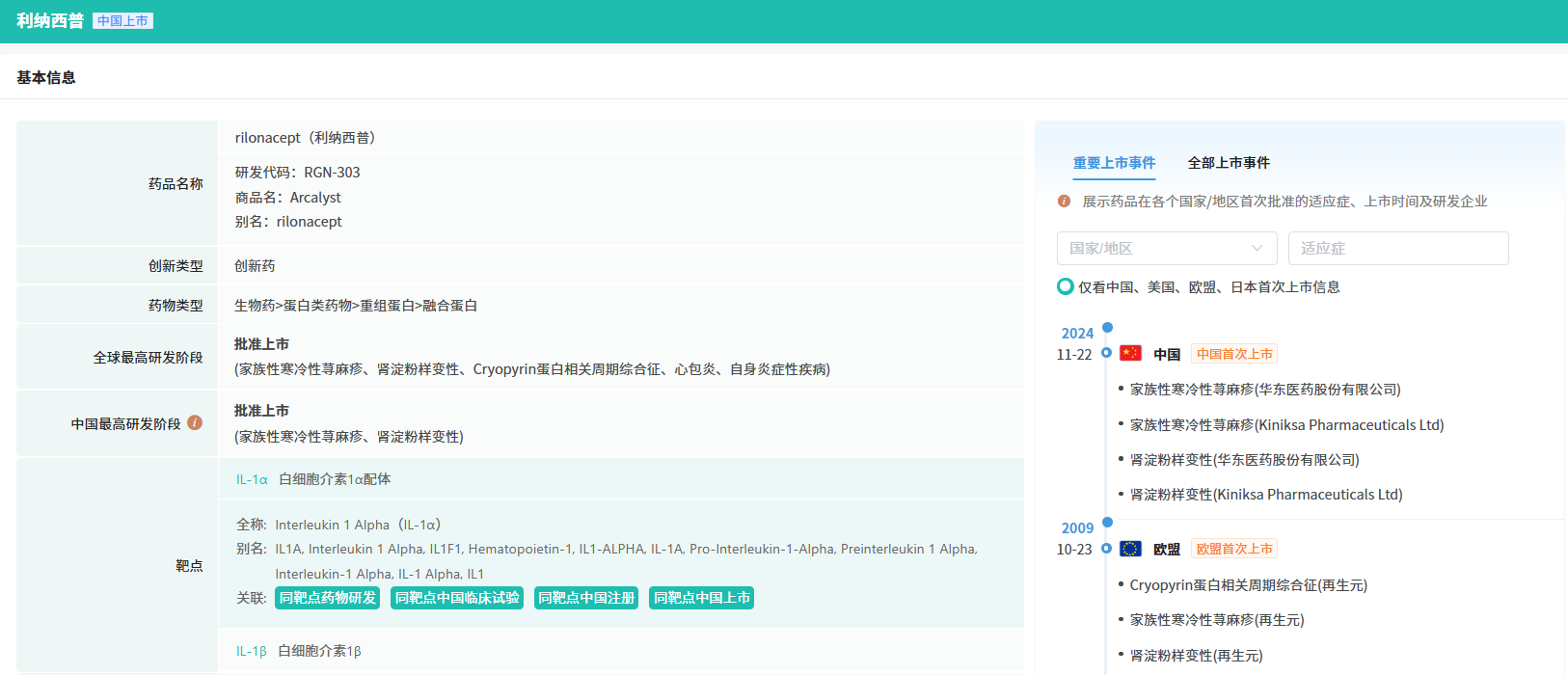利纳西普是一种重组二聚体融合蛋白,通过阻断IL-1α和IL-1β信号传导进行治疗。该产品2008年2月获美国FDA批准,用于治疗冷吡啉相关周期性综合征,包括家族性寒冷性自身炎症综合征和Muckle-Wells综合征;2020年12月新增适应症IL-1受体拮抗剂缺乏症(DIRA);2021年3月再添复发性心包炎适应症,成为FDA唯一批准用于12岁及以上复发性心包炎患者的药物。