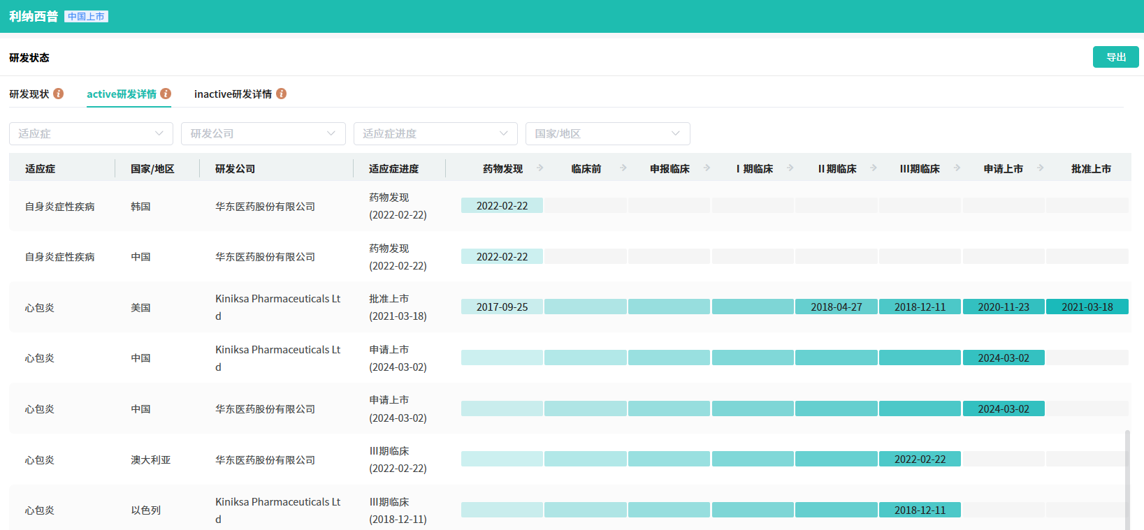 在中国,注射用利纳西普2018年入选《临床急需境外新药名单》。2022年2月,中美华东与Kiniksa达成6.62亿美元合作,获得包括注射用利纳西普在内的两款自身免疫疾病药物权益。中美华东独家拥有该药品在24个亚太国家和地区(除日本)的开发、注册及商业化权利。
