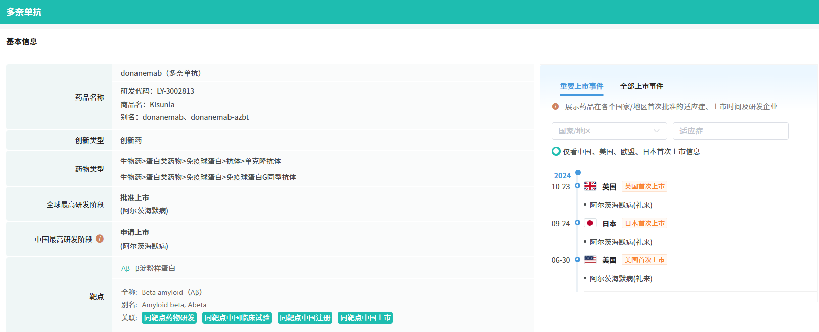 Donanemab是一种用于静脉输注的药物,每四周注射一次。该产品已经于2024年7月获美国FDA率先批准,用于治疗出现早期症状的阿尔茨海默病成年人(商品名:Kisunla)。在美上市仅 5 个月后,全球第二款 AD 新药登陆中国,同时它也是第一款且唯一一款有证据支持,在清除淀粉样蛋白斑块后可停药的靶向淀粉样蛋白的疗法。
