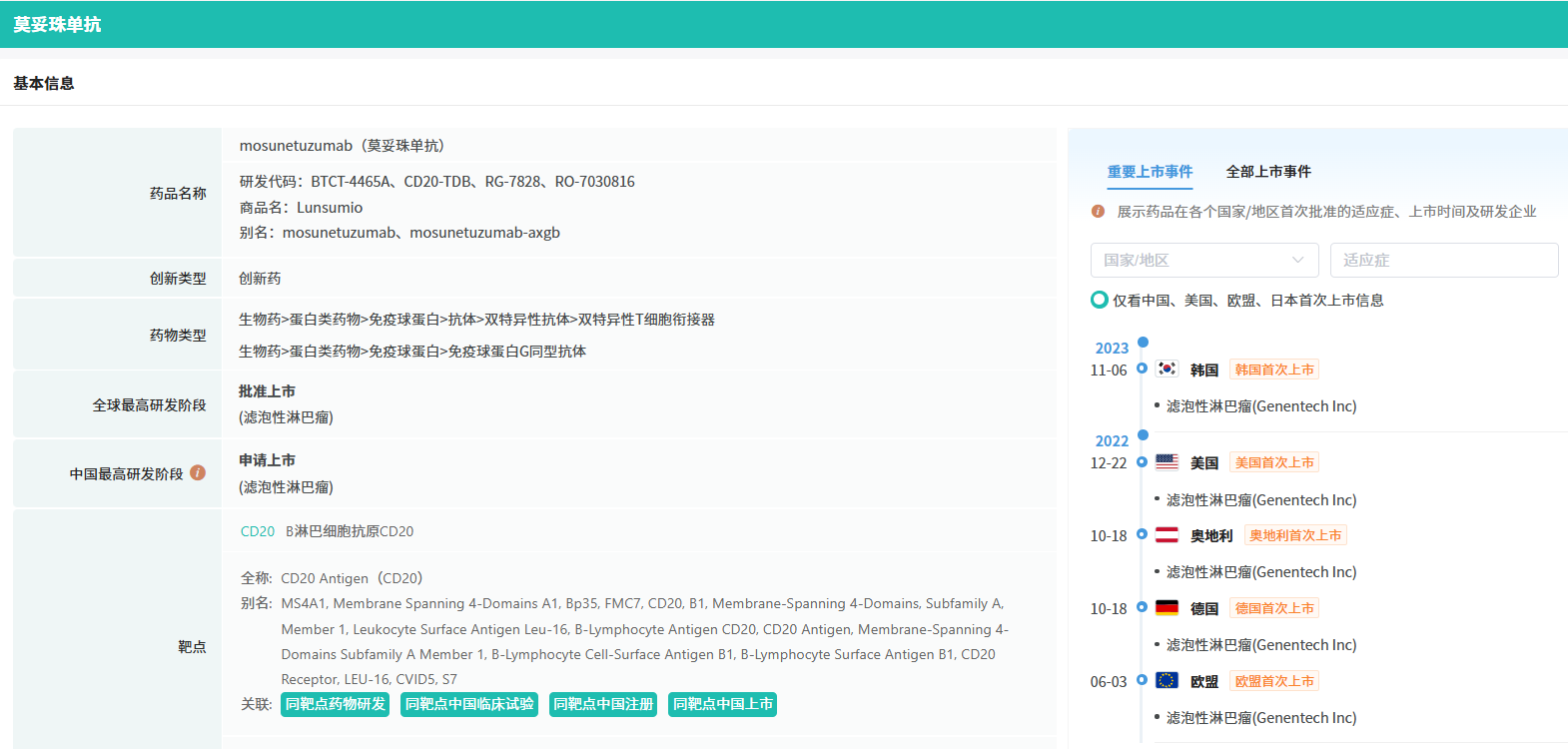 值得注意的是,莫妥珠单抗是罗氏在中国开发的第二款CD3/CD20双特异性抗体。在此之前,罗氏的另一款CD3/CD20双抗格菲妥单抗注射液(商品名:高罗华/Columvi)已经于2023年11月获得NMPA的附条件批准上市,用于治疗复发或难治性弥漫大B细胞淋巴瘤(DLBCL)成人患者。这也是国内首款获批的CD3/CD20双抗药物。