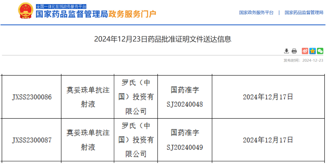 12月23日,NMPA正式批准了罗氏的双抗药物莫妥珠单抗上市,为复发或难治性滤泡性淋巴瘤患者提供了新的治疗希望。这款药物通过独特的双重靶向机制,实现了对恶性B细胞的有效消除,并在临床试验中展现出了优异的疗效和安全性。同时,这也是罗氏在中国开发的第二款CD3/CD20双抗药物,标志着罗氏在淋巴瘤治疗领域的不断创新和突破。