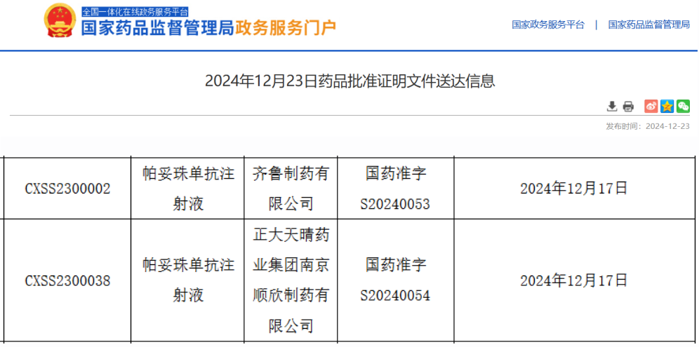 此前,国内帕妥珠单抗市场由罗氏独家占据。然而,随着齐鲁制药和正大天晴的加入,这一格局被彻底打破。2023年1月,齐鲁制药率先提交帕妥珠单抗注射液(3.3类新药)上市申请,同年5月正大天晴南京顺欣制药也紧随其后。此外,在2023年SABCS上,正大天晴的帕妥珠单抗生物类似药3期研究入选壁报,该研究为多中心、双盲、平行对照试验,比较帕妥珠单抗生物类似药与原研药治疗HER2阳性乳腺癌的疗效与安全性,结果显示两者相当。此次齐鲁制药和正大天晴同日获批,不仅彰显了其在生物制药领域的实力,更成功抢占了市场先机。