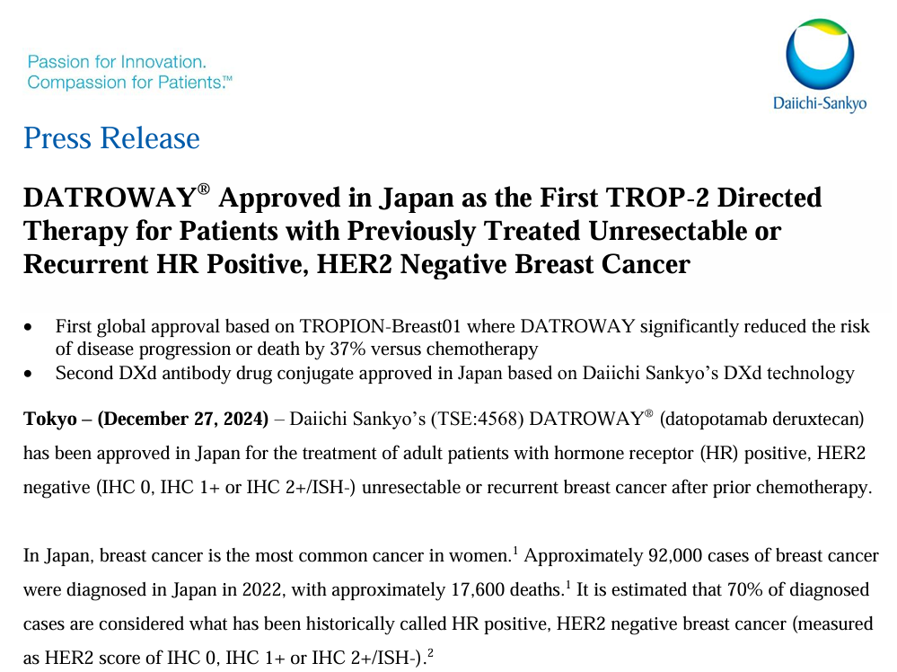 12月27日,第一三共宣布,其 TROP-2 ADC 产品Datopotamab deruxtecan(Dato-DXd ,德达博妥单抗,商品名:Datroway)在日本获批上市,用于治疗既往接受过化疗的成年人HR阳性、HER2阴性(IHC 0、IHC 1+或IHC 2+/ISH-)不可切除或复发乳腺癌患者,这也是datopotamab deruxtecan的全球首次获批上市,也是全球批准的第三款TROP-2 ADC药物。