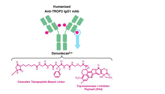 DATROWAY(datopotamab deruxtecan)是一种基于TROP-2靶向的抗体药物偶联物(ADC),融合了第一三共独有的DXd ADC技术和阿斯利康ADC科学平台的尖端成果。它通过将人源化的抗TROP-2 IgG1单克隆抗体与拓扑异构酶I抑制剂负载物(DXd)通过四肽可裂解连接器GGFG相连,实现了DAR值为4的高效负载。这一创新设计使得DATROWAY能够精准靶向癌细胞,有效抑制其生长。