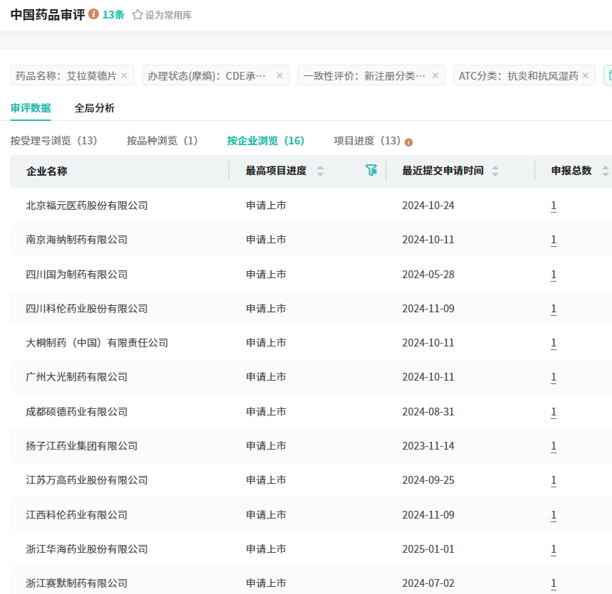 2025年1月1日,浙江华海药业提交了的4类仿制药艾拉莫德片的上市申请获受理。该品种是一种具有抗炎、镇痛作用的小分子类抗风湿性关节炎药物,在全国院内(全终端)市场销售额超12亿。据摩熵医药数据库显示,艾拉莫德片目前有16家药企提交了仿制申请,这一款超十亿的重磅品种,市场争夺战硝烟弥漫。